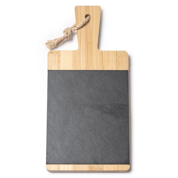 Tocătorul din bambus și ardezie reprezintă un instrument versatil și funcțional pentru bucătărie. Designul său combină frumusețea și durabilitatea bambusului cu caracterul practic al ardeziei, oferind o ustensilă ideală pentru tăierea și prezentarea alimentelor. Corpul plăcii este fabricat din bambus, un material rezistent și durabil, care asigură o suprafață de tăiere solidă și sigură. Bambusul este cunoscut pentru rezistența sa naturală la umiditate și bacterii, ceea ce îl face o alegere igienică și durabilă pentru prepararea alimentelor. Ardezia încorporată în placă permite ca produsele să fie prezentate pentru a ieși în evidență. În plus, dispune de un mâner ergonomic care îl face ușor de manevrat și transportat. Frânghia inclusă vă permite să agățați placa atunci când nu este utilizată, economisind spațiu și ținând-o la îndemână. Acest tocător este ideal atât pentru uz casnic, cât și pentru a fi făcut cadou, deoarece combină funcționalitatea și stilul într-o singură ustensilă de bucătărie.