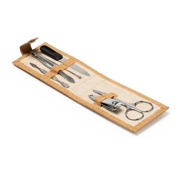 Trusă de manichiură cu cutie din plută și sistem de fixare. Forfecuță din oțel inoxidabil, pensetă, unghieră, pilă și cleștișor cuticule incluse.
