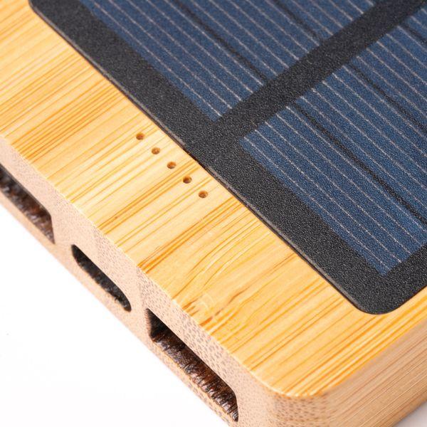 Baterie solară de 5.000 mAh din bambus. Intrare de tip C. O ieșire de tip C și două ieșiri USB. Mod de prezentare: în cutie cu model eco.