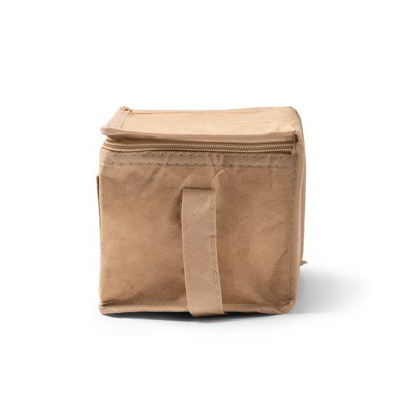Geantă frigorifică din hârtie kraft laminată, cu interior izoterm din aluminiu și spumă de izolare de 2 mm. Mâner de 60 cm. Capacitate de 3L (6 cutii). Închidere cu fermoar și practic mâner pentru a fi transportată.