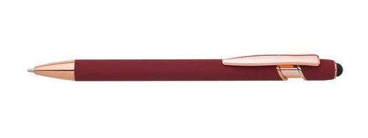 ELLA SOFT metal ballpoint pen with a soft surface, touch tip, and accessories in rose gold. The laser-engraved logo is glossy and rose gold. The ink writes in blue. The laser marking effect is glossy and in the color of the accessories.