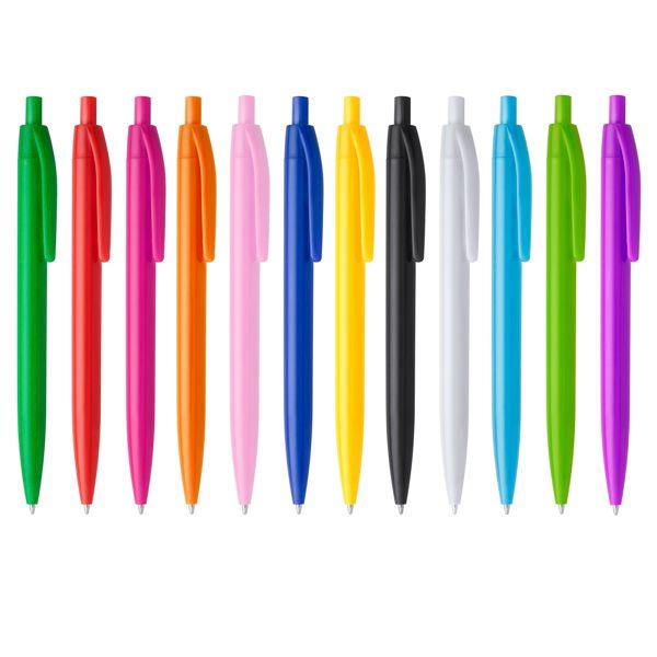 Pix din ABS în diverse culori. Mecanism acționat prin apăsare. Mină albastră.